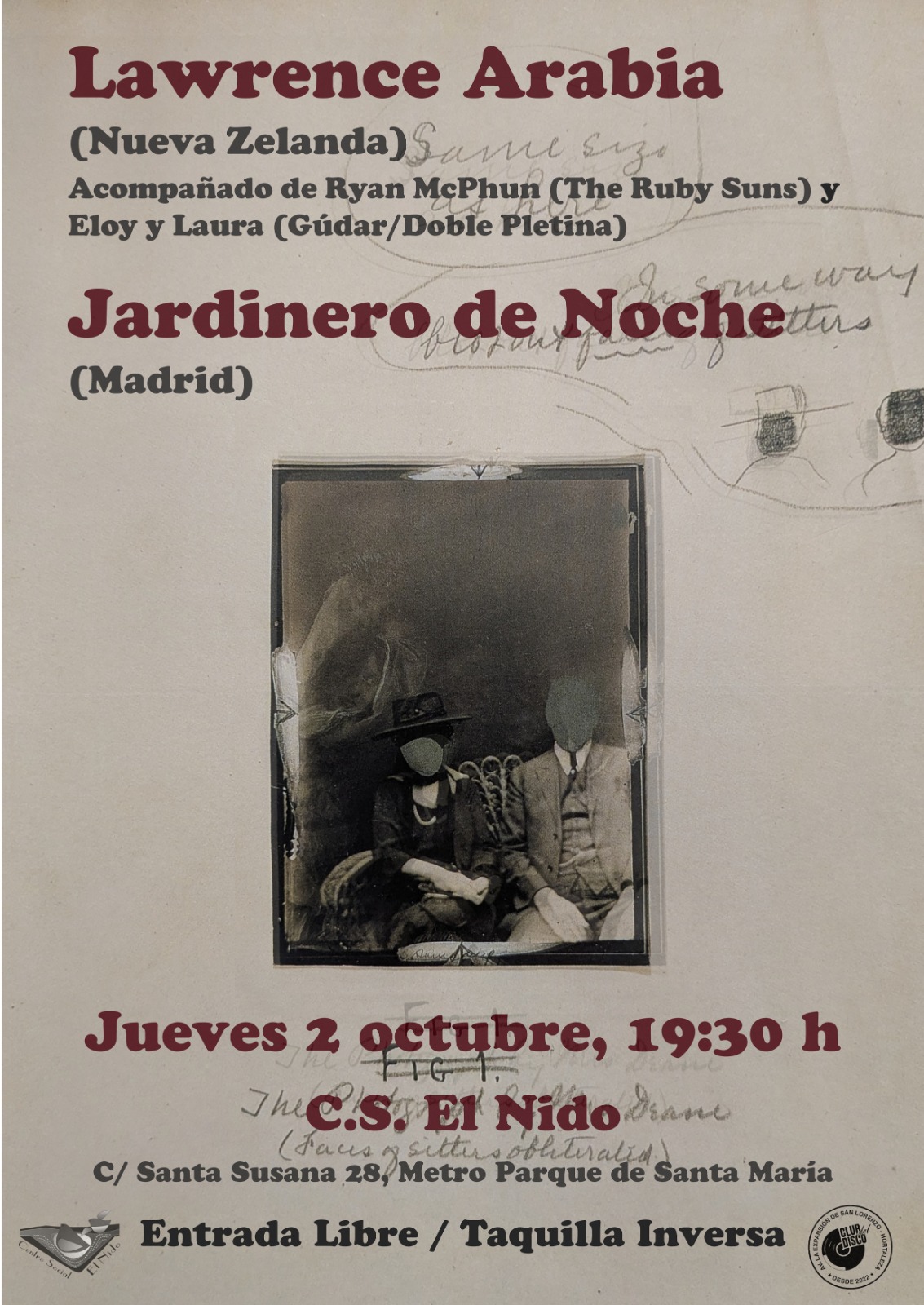 A Lawrence y su banda les acompañarán Jardinero de Noche, un nuevo grupo madrileño compuesto por Jon, Rafa y Meri. Sin guitarra en el grupo, solamente con bajo, batería y teclado, construyen una música bailable y divertida, con influencias que van desde Gang of Four a LCD Soundsystem. Acaban de editar su primer EP, “Gente ocupada”.