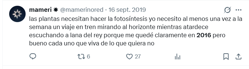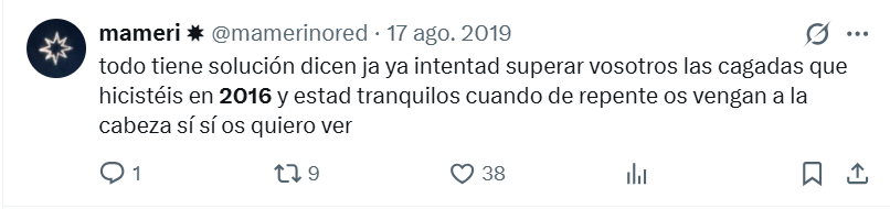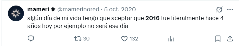 Ha comenzado el año y de repente todo el mundo echa de menos 2016. Me considero experta en el asunto porque si alguien ya ha romantizado ese año todo este tiempo He Sido Yo. No quiero ninguna medalla de mayor yearner de 2016. No por Dios. Solo sé de lo que hablo. Aguanten. Sigan leyendo. Como si tuvieran el span de atención de hace una década. Viajo al cementerio, recorro las tumbas de lo que solía ser twitter en su era dorada. Pongo unos dígitos en el buscador junto a mi arroba. Aquí la prueba.