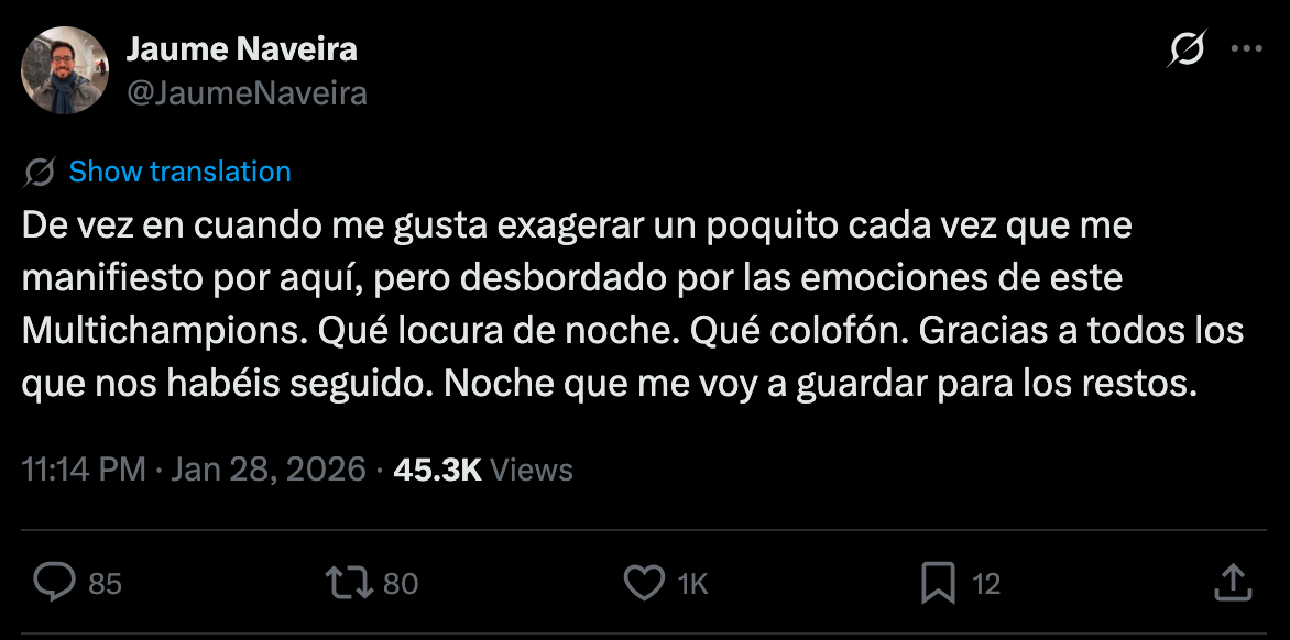 Coño, si ya se está jugando. Cada vez que conectan con Barcelona es un sufrimiento. Lewandowski cumplirá 56 años y seguirá metiendo goles. Suyo es el 1-1. Es imposible que no lo remonten. Si es que te lo tengo dicho. Hostia Salah, qué fino. Lo repito. Favorito para la Champions: el Liverpool. ¡Vamos ahí ese Olympiacos de Mendilibar ganando en Ámsterdam! A ver, Pafos - Slavia, no nos aportas nada, nos estorbas. Parad de marcar goles, primer aviso. Otro del Liverpool. No lo voy a repetir más veces. Hugo piernas infinitas Ekitike, dice Fermín. Qué genio es. Primera conexión de la noche con el PSV - Bayern en el minuto 57. Hombre, Musiala, si estás de vuelta. Lo último que supe de ti era que Donnarumma te había partido el peroné. Celebro verte de nuevo, celebro el gol que acabas de marcar. El Bodø/Glimt acaba de meter el gol más barrista y ratonero que he visto en mi vida. Por increíble que parezca, se han puesto por delante en el Metropolitano. Hombre, qué alegría, otro del Benfica. Las últimas tres conexiones han sido goles al Villarreal, Atlético y Real Madrid. Je je je. El fútbol español y tal. Y otro del Barça. Si es que no aprendo. La noche está empezando a cambiar. Los tantos del Chelsea y Sporting de Portugal amenazan el topocho merengue. Anda que si nos quedamos fuera… menos mal que Kylian acorta distancias en Lisboa. Lleva 13 el animal. En medio de la orgía de goles y cálculos improvisados, me entero de que cada vez que marca el Union Saint-Gilloise suena el Vamos a la playa en la megafonía de su estadio. Pinta fea la noche para los equipos madrileños. Veo la clasificación actualizada y sufro. Qué cante del Atlético, por Dios. Golazo de Saibari al Bayern. ¿Este fue el gilipollas que quiso quitarle la toalla al portero de Nigeria, no? Goles y más goles. Esto ya no hay quien lo pare, esto ya ha entrado en el territorio de la locura. Recapitulamos. El gol del Brujas echa al Marsella, el del Inter en Dortmund (primera conexión en el 80) mete a los italianos en el top 8 y echa del mismo al PSG (ay ay ay el Madrid), y el de Joao Pedro en el 82 clasifica al Chelsea, saca justamente al Inter y elimina al Nápoles. Harry Kane, otro como Lewan. Jugadorazo ha sido siempre, marcará hasta que quiera. Nuestros amigos del Pafos - Slavia nos permiten coger el aire. Los chipriotas están a tres goles de meterse. Bueno, ahora a dos. Espera, que acaban de meter otro. ¿Ah, que si meten uno más se clasifican? ¿Qué más quieres hacer con nosotros, noche de última jornada de Champions? El Madrid está en la cornisa en el 88, apunta Naveira. Si mete el Sporting, el PSG, la Juve o el Tottenham estamos fuera. Qué desastre. Otro del Liverpool, ya no sé cuantos lleva. Pues ahí lo tienes, gol del Sporting. No sé ni qué decir. Empiezas la jornada tercero y la vas a acabar noveno. En fin. Acaba en Bilbao, los portugueses son topocho. Sin noticias de Da Luz. Buen cante del Atleti también, palmando en casa con el Bodø/Glimt. Honor a los noruegos, primera participación en champions y clasificados para la siguiente ronda. El Cholo alguna vez podría dar la mano al rival. Conectamos, por fin, con Lisboa. Quedan tres minutos. han expulsado a Asencio no sé por qué. No sé nada del partido desde el segundo gol de Mbappé. Veo que está Cestero, no así Gonzalo. El centro de Camavinga va a ninguna parte. Roja a Rodrygo. Ahora mismo el Benfica está fuera de los 24 equipos clasificados y el Madrid fuera de los ocho primeros. Ambos necesitan marcar. Esto no le vale a nadie. De los 18 partidos que hay, el macabro guionista del fútbol ha decidido que el drama tenía que estar aquí. En Da Luz. Con el Madrid. No podía ser en otro estadio. Tiene la última el Benfica. La falta es un poco lejana, no debería ser peligrosa. Mourinho le dice al portero que suba y yo pienso que todavía les podemos cazar a la contra con la portería despejada. Hay esperanza. La cuelga Aursnes. Qué. Qué acaba de pasar. No me lo creo. La última jugada del último minuto del último partido de la última jornada. Y gol del portero. Y el Benfica, por primera vez en toda la noche, clasificado para la siguiente ronda. Es la Champions. Es el fútbol. Es el multi. Las mejores noches de nuestras vidas.