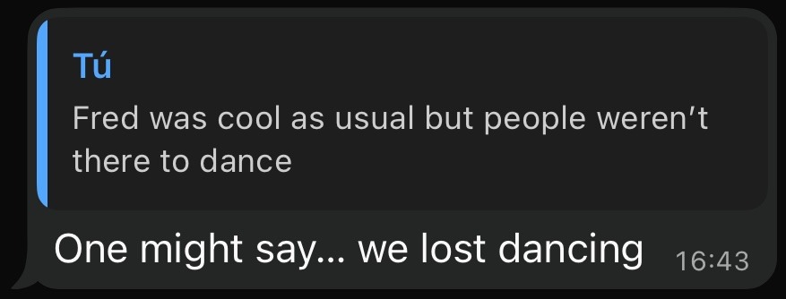 Supongo que Frederick tenía razón cuando decía que we’ve lost dancing. Nuestra identidad digital tiene tal peso hoy en día que somos incapaces de guardar el móvil durante seis horas. Nuestra adicción es tal, que si no lo grabamos, es como si no hubiésemos ido. No sé si dice más de nuestras ansias de documentarlo todo o de nuestra necesidad de ser percibidos.