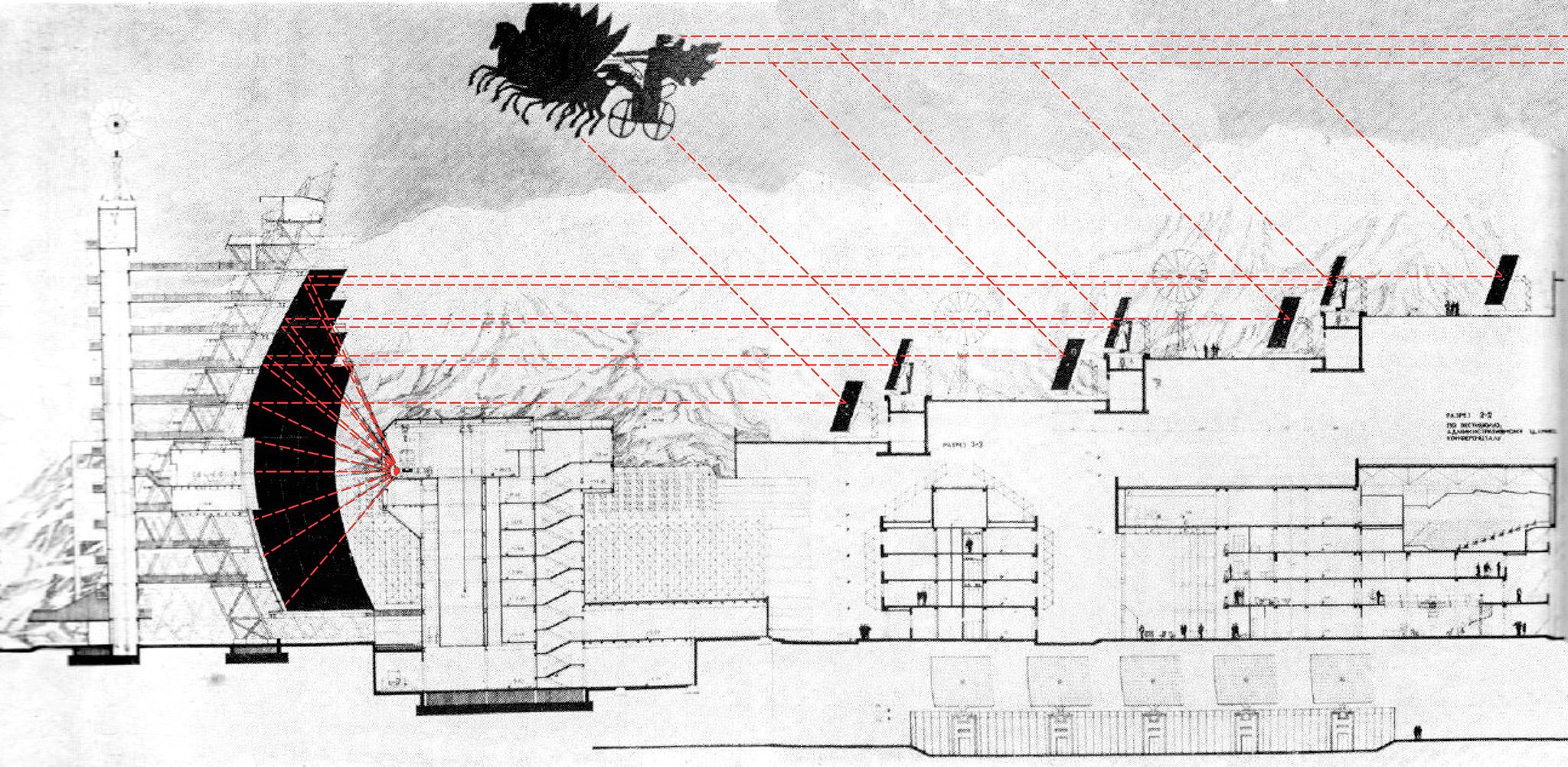 El lema de la Biennale de este año fue Intelligens. Natural. Artificial. Collective. Los comisarios del Pabellón de Uzbekistán tradujeron esto en una exposición en torno al Instituto solar de Uzbekistán (1981), una macroconstrucción soviética que entiende la inteligencia como progreso y se cuestiona el futuro y la paradójica naturaleza de esta estructura. Mis partes favorita son el grabado que se hizo en una placa sobre la ladera donde más tarde se asentaría el Heliocomplex donde pone algo parecido a Por voluntad del Partido, por el deseo del pueblo, el Complejo del Sol será construido aquí, y el dibujo de la sección, donde aparece un misterioso personaje volando sobre un carro alado.