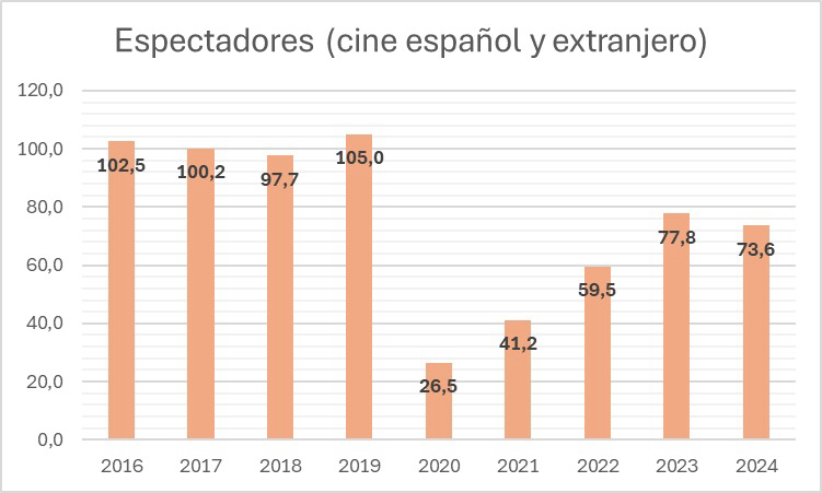 Pero la culpa, o digamos responsabilidad, no es de Netflix, o no sólo suya. Los datos de taquilla revelan que en España (y en mayor o menor medida en todo el mundo) habíamos dejado de ir al cine ya hace tiempo. La gráfica revela que no nos hemos recuperado aún de la pandemia, y que seguimos lejos de los niveles de 2019.