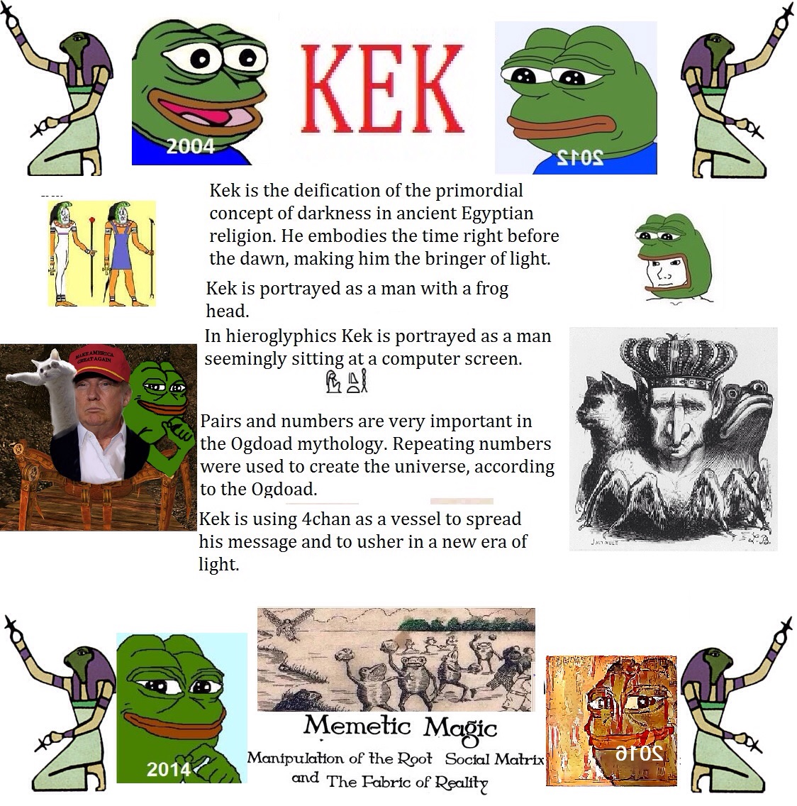 Pero más allá de futuros especulativos por llegar, ya se hablaba de cómo en 2016 la elección de Donald Trump fue invocada a través de los memes. Gracias a la difusión de imágenes de Trump junto a uno de los memes más antiguos y oscuros de internet, la rana Pepe, se consiguió una cierta forma de hiperstición. Los usuarios de 4chan buscaban coincidencias constantemente en el número del post y cuando estos se repetían o acababan en un número concreto como el 7 le daban un cierto valor místico. Esta tendencia de atribuir valor esotérico a ciertas coincidencias también se conoce como sincromisticismo. Así pues, cuando el post 77777777 apareció con el mensaje “Trump will win” todos los foreros empezaron a contestar “Meme-magic is Real”9. Casi nadie lo decía en serio… pero cuanto más repetían la broma, más parecía volverse real. La ironía, que en teoría los protegía de creer en ello literalmente, terminó reforzando la sensación de que la “magia del meme” existía de verdad.