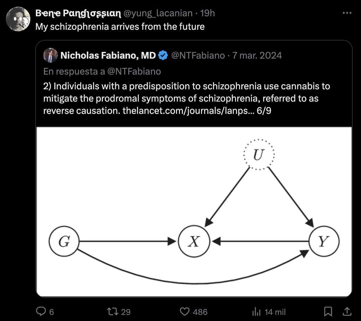 Como explica en el siguiente tweet, es la predisposición a tener esquizofrenia lo que le lleva a consumir cannabis. El pensamiento lineal al que estamos acostumbrados sería: consumo cannabis y esto me provoca la esquizofrenia. Desde una perspectiva retrocausal, yo ya soy potencialmente esquizofrénico en el futuro y es esa condición incipiente la que me lleva a consumir cannabis hoy. Por eso dice que la esquizofrenia le llega del futuro.