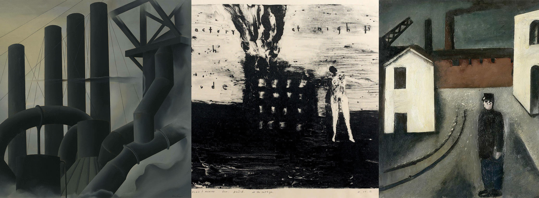 Tirando del hilo, de esta corriente fotográfica de mitad de los 60, encontramos esta casi fetichización de las fábricas también dentro la escuela de pintura precisionista de los años 20. Un pequeño movimiento muy americano que tomó prestada la influencia de los ismos europeos y la mezclo con un carácter marcadamente industrial. Los carteles publicitarios (evidentes en la obra de Ruscha), los rascacielos, la maquinaria son los protagonistas de nuevo. La ausencia de humanos vuelven los entornos un poco amenazantes, irreales, postizos. La idea de que el mal acecha en cualquier esquina y donde menos te los esperas, también es un idea muy lynchiana. David no necesita de la paciencia de esta pintura, más bien emplea técnicas mucho más sucias y rápidas como la litografía para representar sus escenas de pesadilla rodeadas de humo sucio y textos crípticos.